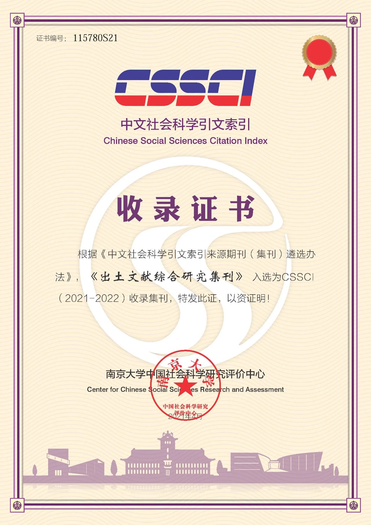 近日,西南大學漢語言文獻研究所接到南京大學中國社會科學研究評價中心來函通知:根據《中文社會科學引文索引來源期刊(集刊)遴選辦法》,《出土文獻綜合研究集刊》入選爲CSSCI(2021-2022)收録集刊。據悉,這是《出土文獻綜合研究集刊》2014年創刊以來,首次入選爲CSSCI來源集刊。